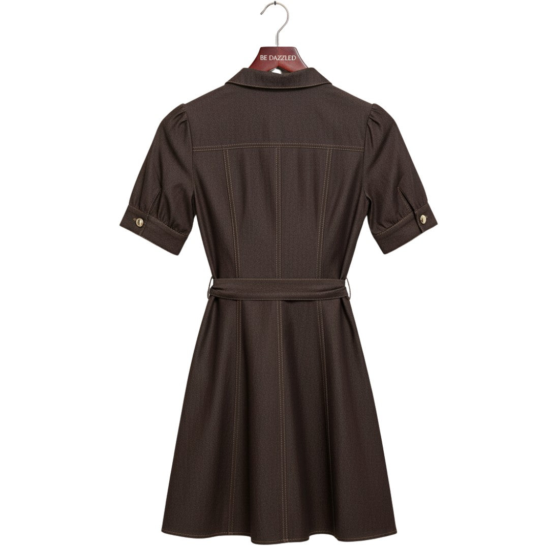 Effortless and versatile, this belted denim shirt dress transitions seamlessly through every season. The soft, stretch chocolate denim offers a perfect balance of casual comfort and refined style. A belted waist creates a flattering silhouette, making it easy to dress up with pumps for dinner in the city or keep it laid-back with ankle boots for everyday errands.